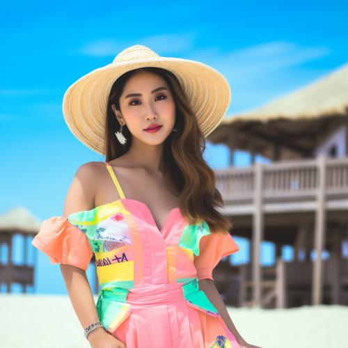 2 instagram asian woman influencer pose for upcoming summer neon theme fasion log book for beach wear. style: real photo. the two piece beach wear for beach use