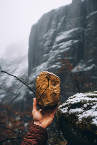 Hyperrealistic 35mm f2.8 highly detailed photography of a climbers hand holding the stone between wood and leaves and a mountain in the background in a cold island snow landscape on a rainy day, 8k, --ar 2:3
