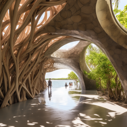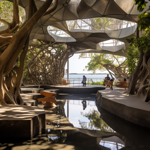 inside of concrete steel frank gehry horizontal volume architecture, surrounded by mangrove and sea