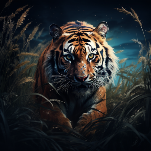 a hyperrealistic large, strong, smart tiger in a jungle with colourul birds flying around and a cameleon