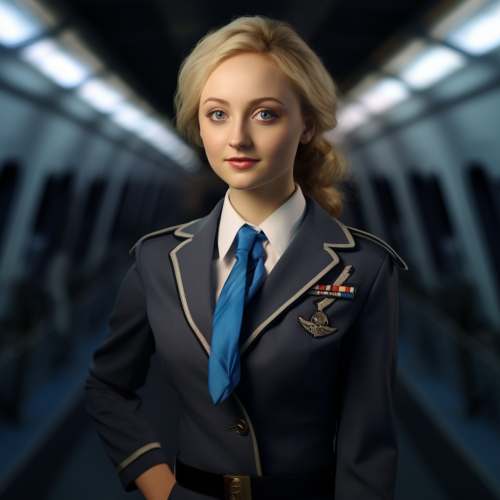 Evanna Lynch as beautiful stewardess, photography, top model, hyperrealistic, detailed, 16k, --v 5.2
