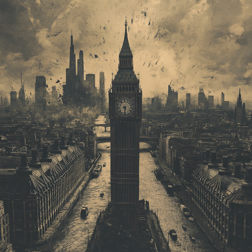 London city, Big Ben surrounded by boring concrete modern skyscrapers buildings, looks like socialism atmosphere, beautiful but dark and void, Jan Å vankmajer style