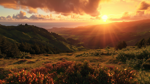 the most beautiful view of Sao Miguel, sunset, hyperrealistic --ar 16:9 --style raw --v 6.0