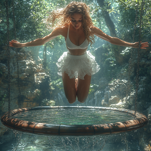 a woman jumps from a trampoline with arms held up and together diving up in the air portrayed just before hitting the surface of the water, intricate details, photorealistic, cinematic, hdr --v 6.1 --s 750