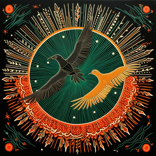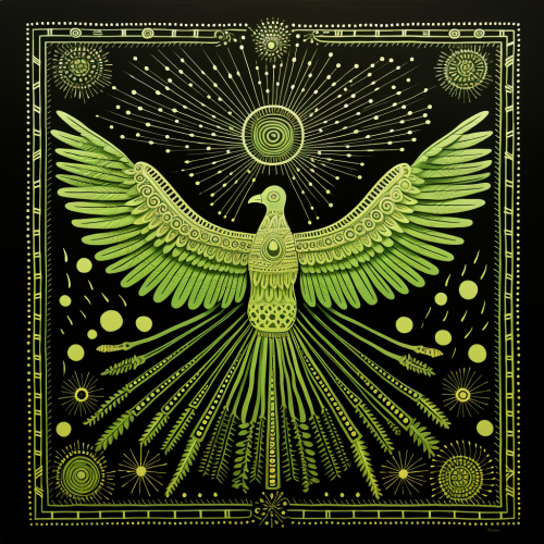 Icarus and Daedalus flying to the sun + block print, style of Gond Painting, Jungian mythos illustration, green on black radiating geometric patterns, stunning, beautiful, precise lines, dynamic, expressive, rule of thirds, kaleidoscopic, aboriginal, fractal, colourful