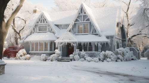 a traditional northern midwestern style home shot with a Canon C70 from street view, the house has not heat, so it's completely covered in ice feeling very cold --ar 16:9