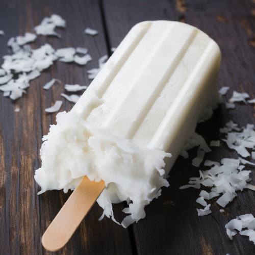 brown kraft paper pints of hard ice cream, all with lids, stacked in a pyramid on a white marble counter with a dark background, lit from the side, pints are plain in color without texture, hyperrealistic cartoon style