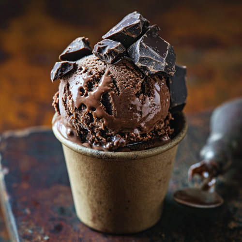 a scoop of dark chocolate ice cream in a cup topped with chunks of chocolate cookies, shot in a studio, realistic and bright lighting. --v 6.0