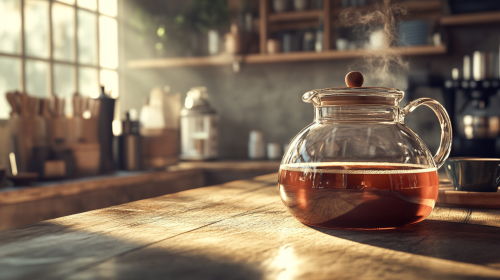 Create an ultra-realistic close-up of a large glass coffee pot filled to the top with rich, dark coffee, resting on a wooden counter in a rustic café. The pot is clean and transparent, with visible steam rising from the coffee, indicating it is freshly brewed. The glass surface reflects the soft November daylight streaming in, casting warm, subtle highlights that enhance the inviting feel of the scene. In the background, the cozy café interior is softly blurred, showing hints of wooden shelves, mugs, and coffee supplies, adding to the rustic, comforting atmosphere. The lighting is diffused, casting gentle shadows on the counter and emphasizing the coffee pot’s realistic, well-used look. --ar 16:9