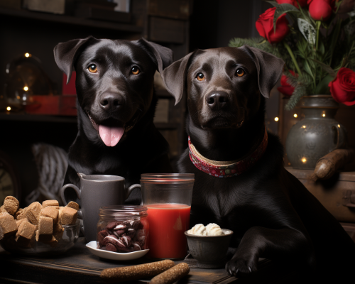 A happy 2-year-old, 85-pound, all black Labrador retriever and a happy 1-year-old 70-pound all black Labrador-springer mix enjoy a delicious cup of coffee together, genndy tartakovsky, strong chiaroscuro, happy festive mood --ar 5:4 --s 750