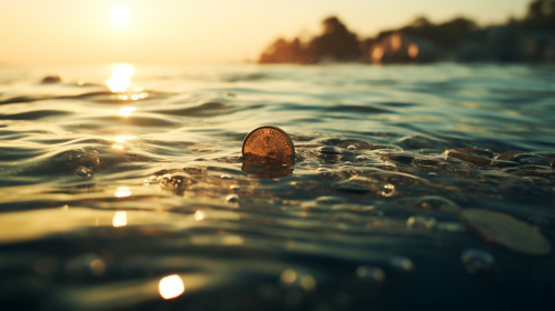 /imaginesharp aerial tight shot of beautiful ancient and worn biblical coin floating in navy blue water at sunset with bokeh and depth of field shot on a Canon 6D --ar 16:9 --s 250