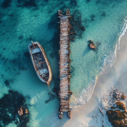 aerial view, seashore, white sand, ruined pier, old boat, nets, seagulls, sunny autumn, clear water, mood of happiness and peace, top down view, cinematic effects, photorealism, wallpaper --s 250 --v 6.1