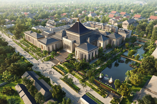 bird eye view perspective.grand mosque. one massive mass building. sustainable design. attractive organic roof . pond in the front of building. high ceilling. modern architecture. vernacular indonesian concept adaptation. banten palace concept. rectangular siteplan. two hectare siteplan. building area 50% of two hectare. organic siteplan layout. --ar 3:2