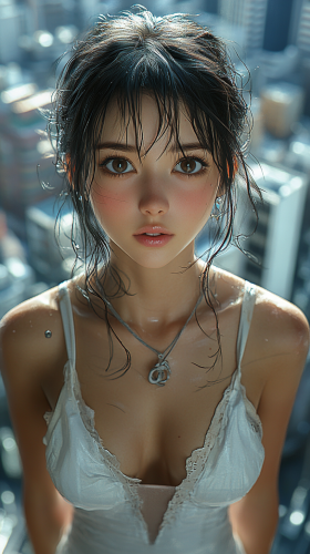 Japanese animation style bird's-eye view, beautiful girl, deep charming eyes, soft and vibrant pink and peach eye makeup, radiant face, ethereal aura, delicate facial features, soft pink lips, slightly tearful intense Gaze, dreamy gaze, wearing a white wedding dress, exposing shoulders, and wearing metal earrings. Standing on the roof of a super high-rise building, I feel like jumping back. Surrounded by building roofs, the character is standing on the highest point, white and blue. The refraction of light creates a cold and dangerous atmosphere, and the overall structure is cold and stunning. --ar 9:16 --style raw --stylize 800