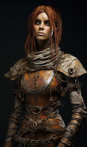 Singer Iggy Pop as an older fantasy merchant woman. Strong and muscular. Dark brown straight hair. Grey armor. Colors in bronze, dark brown, light brown dark red, white and silver. Detailed. Painted. Painted. Fantasy art. --ar 3:5