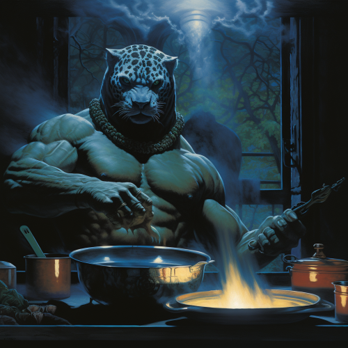a jaguar warrior, massive biceps, cooking, giant pot, at night, hobbit tavern, in the style of ted nasmith, dark cyan and bronze, brothers hildebrandt, dark fantasy, vhs, jungle