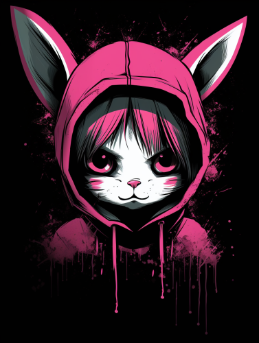 Angry And Grimy child wearing pink hooded bunny pajamas Shoulder up portrait. Dark background. Screen printing style. Heavy black line work. --ar 3:4 --v 5.2