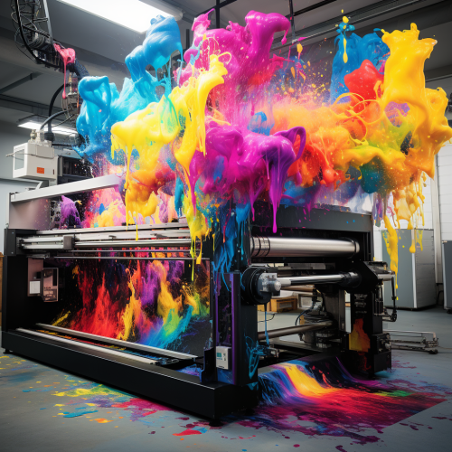 a cmyk jet printer at three quarter angle coming to life and exploding ink everywhere