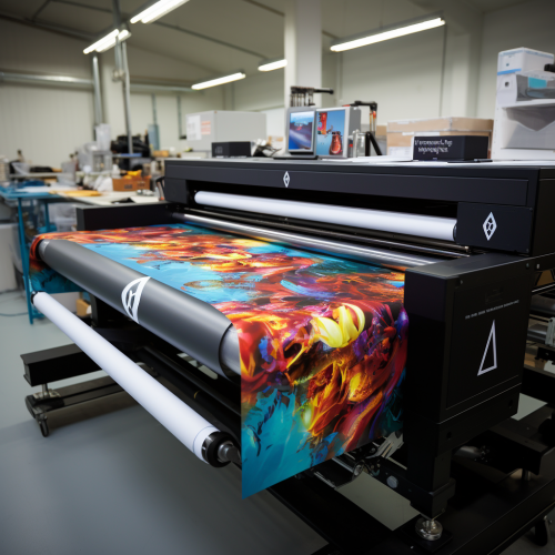 someone outsourcing their printing to a contract printing company. Show someone presenting a print shop to a customer with many printing machines in the background like screen printing, embroidery, DTF printing and more.