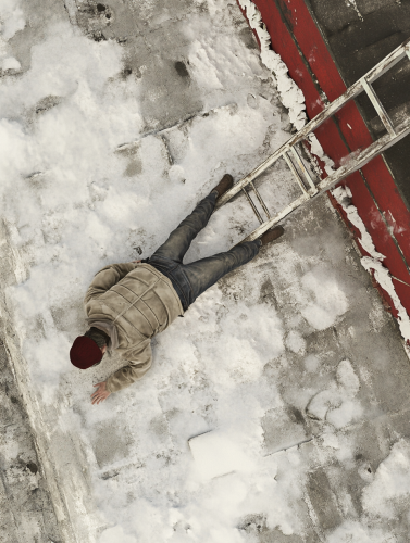 High-definition photo from a single story rooftop perspective looking downward. A metal ladder extends down from the edge of the roof to the ground below. On the ground, a human is lying flat in a humorous and exaggerated pose, because he has just fallen. The scene should capture the view from the roof, with the ladder prominently in the foreground and the human visible below. --ar 3:4