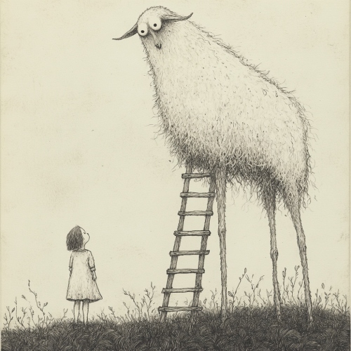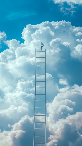A large corporate ladder is depicted stretching into the clouds. Maya is seen climbing the ladder, but each rung is made up of different ethical challenges --ar 9:16 --v 6.1