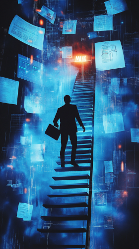 The Journey Upward Concept in corporate world: Maya is depicted climbing a steep corporate ladder or staircase, with symbols of career success like documents, graphs, and briefcases attached to the steps. Above, glowing lights or open doors await. --ar 9:16 --v 6.1