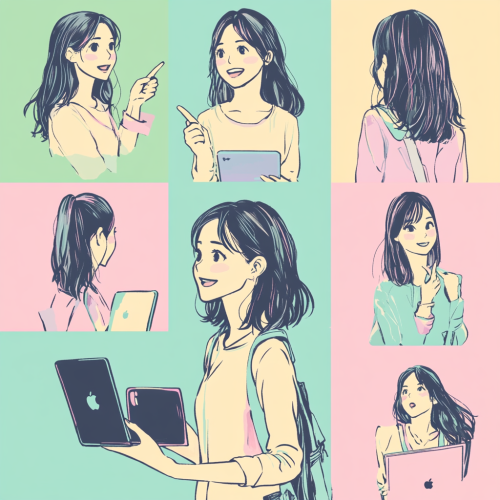 In a simple and calm illustration style, depict a 30-year-old Japanese woman holding a Mac computer, smiling with an eye on the future. Include several cuts showing her talking, laughing, smiling, pointing, and thinking. Please use color variations of pink, blue, green, yellow, and purple for the overall tones
