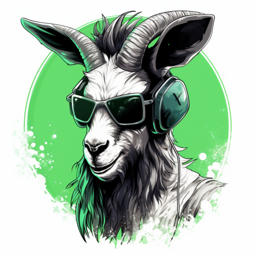 a goat with sunglass and horns that trun into headphones. Balck and white anime style white background with a green lightsaber drawn.
