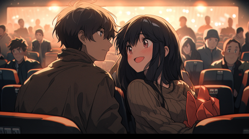 animated movie screenshot of a brunette girl and brunette guy holding hands at the movie theater while watching a movie, cute movie scene, --niji 5 --s 250 --ar 16:9