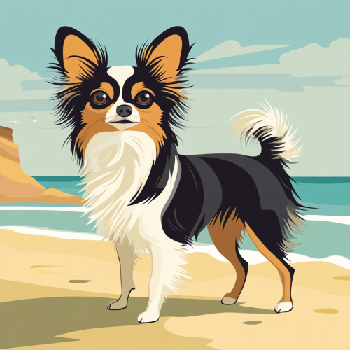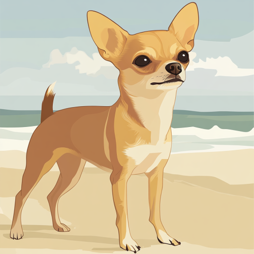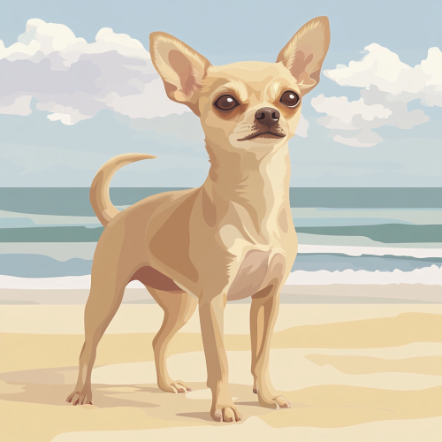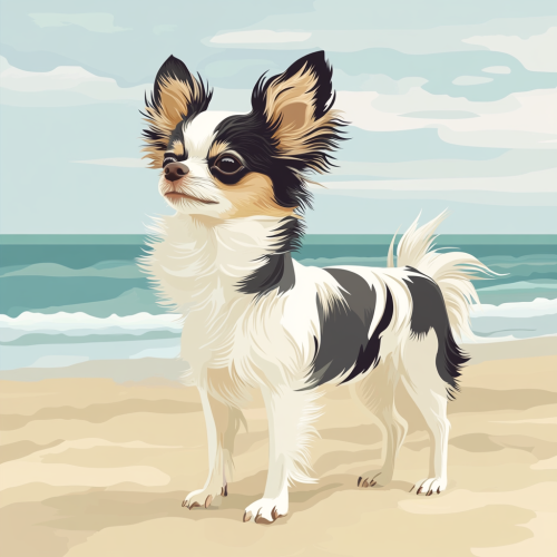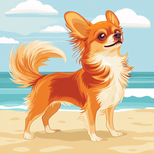 Illustration: Chihuahua with long hair, majestic, sandy beach.