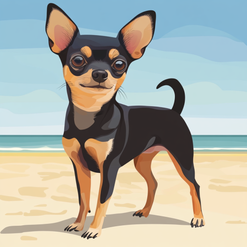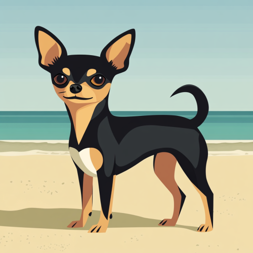 Create an illustration of a single short-haired Chihuahua with black and tan markings, standing on a sandy beach. The dog should have sharp, alert ears and a confident expression, with its posture proud and steady. The background should show the ocean and beach under a clear sky. Utilize flat design with simple shapes, vibrant colors, and no gradients or shadows to create a clean, contemporary look. --v 6.1