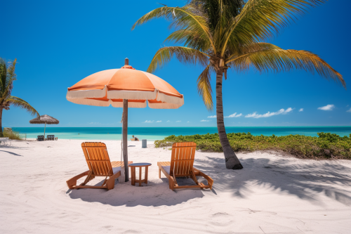 a photo of a beautiful sandy beach in Florida on a bright sunny day with palm trees, a beach umbrella and three lounge chairs --ar 3:2