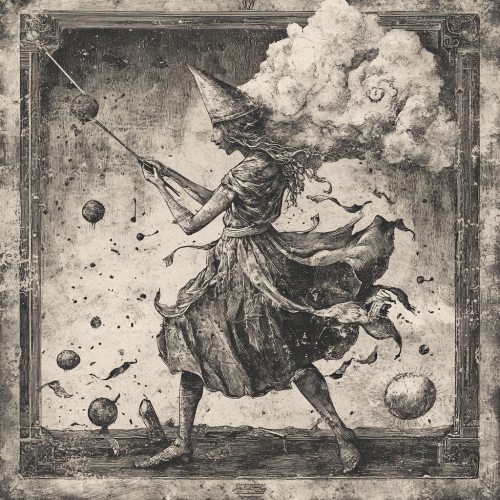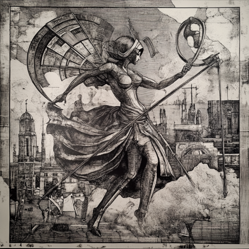 tarot style illustration hieronymus bosch inspired, etching black on gray background, asexual god Hestia fighting off dust in the city. Hesita has an androgyn appearnace yet wears facial hair. Hestia should be shown holding contemporary urban dust fighting technologies or modern street-cleaning technology, such as sweeping machines and air filters, into the design. The dust particles should form abstract, intricate patterns around them, symbolizing both pollution and the efforts to cleanse the urban space.