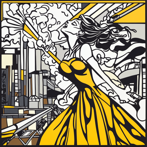 tarot style illustration roy lichtenstein, hieronymus bosch inspired, etching black on gray background, godess Hestia fighting off dust in the modern city. They wear face mask, and are operating contemporary urban dust fighting technologie sweeping machines and air filter maschine. Hesita has an androgyn appearnace. --no breasts, sexualisation, feminine