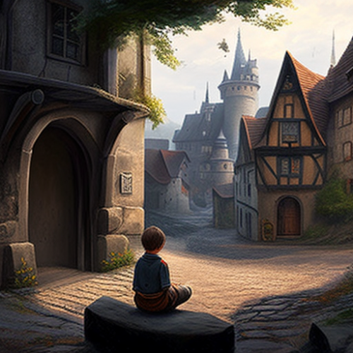 a boy sitting on a cobblestone street in front of a castle, by Michel Delacroix, medieval city background, medieval town landscape, illustration matte painting, inspired by Michel Delacroix, medieval town, medieval village, medieval concept art, town background, game art matte painting, the streets of baldur's gate, video game environment design, storybook illustation, --v 4