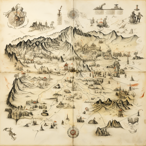 an etching of an early world map, showing folds, as it used to be folded and forgotten,, shot from above, aerial view, in a basic not to elaborate style, roughly sketched, with a route that goes through different landscapes, on it : a village, a forest, a bridge, mountains, a valley, a dragon, a holy grail, highly detailed, medieval, inspired by the maps of game of thrones and lord of the rings