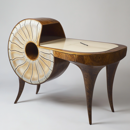 please make a desk based on an ammonite fossil, round, with the opening on top, which becomes the desk surface, but more modern style, and modern 30s colours, like a 30s vintage french poster promoting the riviera