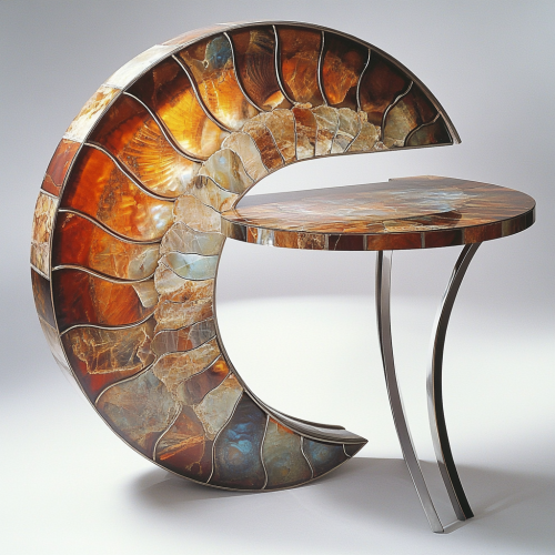 please make a desk based on an ammonite fossil, round, with the opening on top, which becomes the desk surface, but more modern style and conceptual, and modern 70s colours