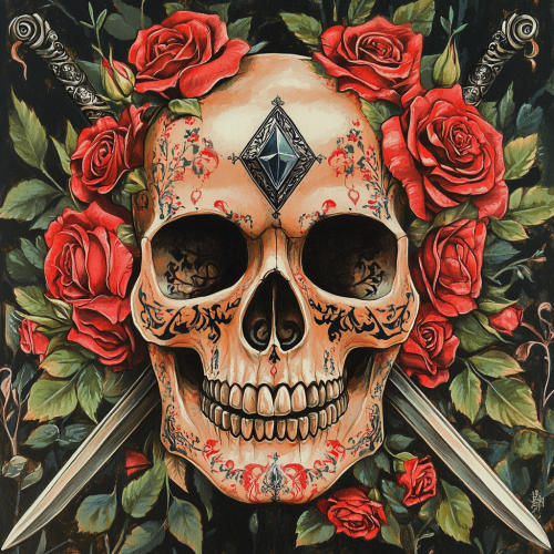 tatoo art,A detailed illustration featuring a skull at the center, adorned with vibrant red roses and silver swords. The skull has a prominent grin and is embellished with a diamond shape on its forehead. Surrounding the composition are green leaves, adding depth and contrast to the bold colors and intricate patterns.tatoo art --ar 16:9