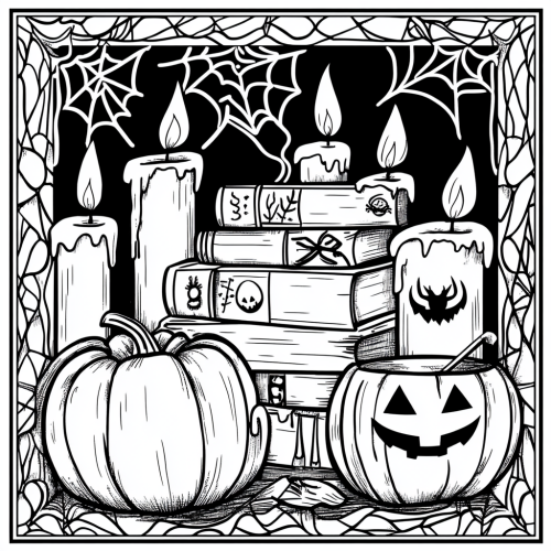 Black and white coloring page: A cute, kawaii scene with Halloween-themed elements, featuring a stack of books with Halloween symbols on the spines, candles with flames shaped like spider webs, and pumpkin-shaped coffee mugs. The design is framed by an intricate web-patterned border, with bold black outlines and no color