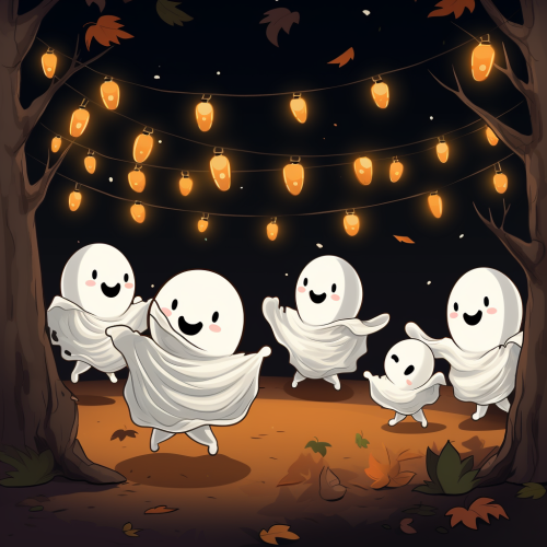 a group of cute white sheet ghosts partying and dancing in a backyard on an autumn evening, there are string lights hung between the trees to light up their party that is happening in the forest, they are cheery and the light can illuminate some of the fall leaves that are on the trees and on the ground, in the style of a simple cartoon, on a solid black background, --ar 1:1