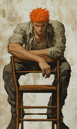 Illustration of a man standing behind a simple chair, leaning and standing with his arms on the back of the chair. The young, cool man holds a cigarette in his hand. Illustration of full body not seen through. His hair is orange with an outside curl. He is dressed in a rough outfit with his shirt sleeves rolled up. --ar 3:5