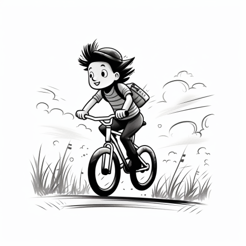 A little boy rides his bicycle quickly, going downhill, in the style of line drawing style, cartoonish, black and white, editorial illustrations, playful character design, li - core, simple, minimalist, versatile, Notioly style