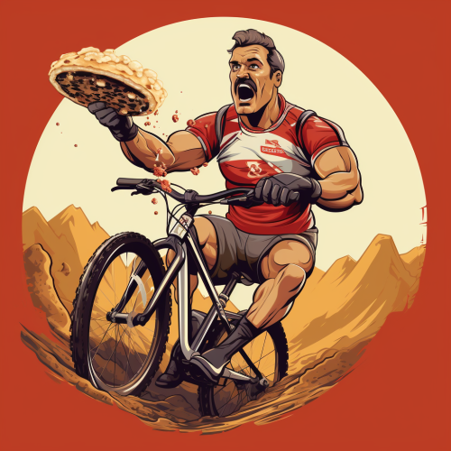 a large middle aged austrialian rugby player on a mountain bike. He has one hand on the handlebars, and the other holding a meat pie. Vector graphic style