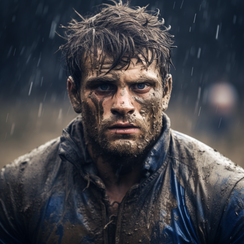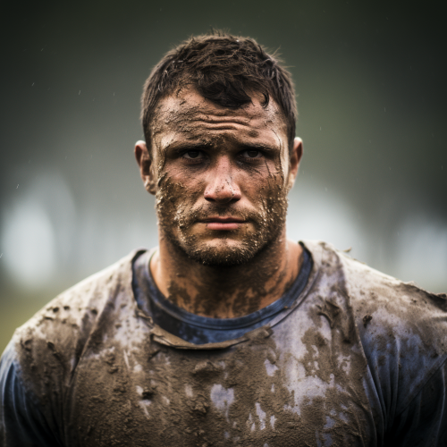 a french rugby player, drenched in mud and sweat, looking intensely into the camera, dramatic lighting, rain, upper body portrait, large format camera, portra