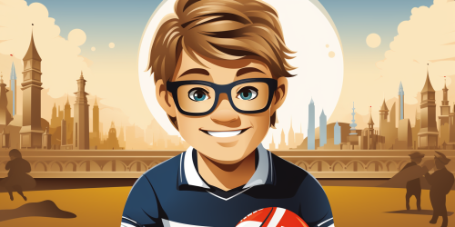 a kid birthday invitation card on the French rugby union team theme cartoon style vibrant color single rugby kid player with light brown hairs round glasses light brown eyes --ar 2:1