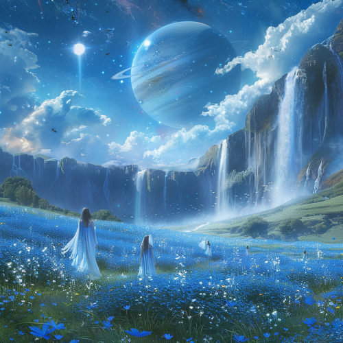fairies in a field of blue flowers with waterfalls in the distance as the planet jupiter hangs low in the sky