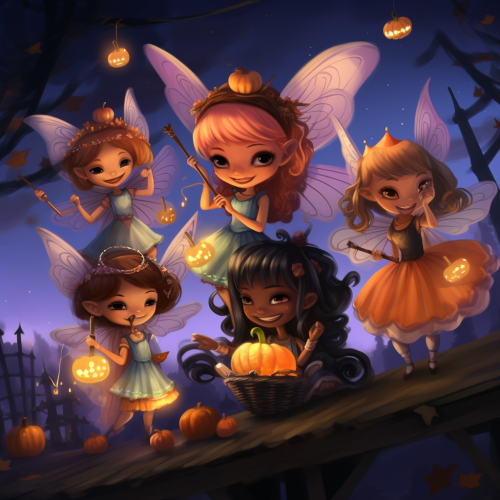 Create a hyper realistic image of something beautiful and breathtaking that is about the Halloween and Fall Season and a group of diverse looking fairies who have very large wings on their back and have different hair colors and wing designs attend an outdoor dessert and tea table setting with lanterns. It is a festive gathering of fairy friends at the dessert and tea table.--ar 4:5 --v 6.1