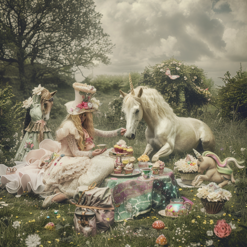 the setting is a grassy hilltop, grey tattered cloud fabric is caught on the tops of the hedgerow that surrounds a clearing where a mad hatter with a large hat hosts a tea party with tie dyed cupcakes on a picnic blanket where happy friends in old fashion clothes circa 1900s. A Majestic Pegasus and a centaur frolic happily. Glowing green and crystal link mushrooms grow in the grass. There is a giant tea cup receiving pristine clean glittery water from a water fall. Hyper realistic photo with high detail.