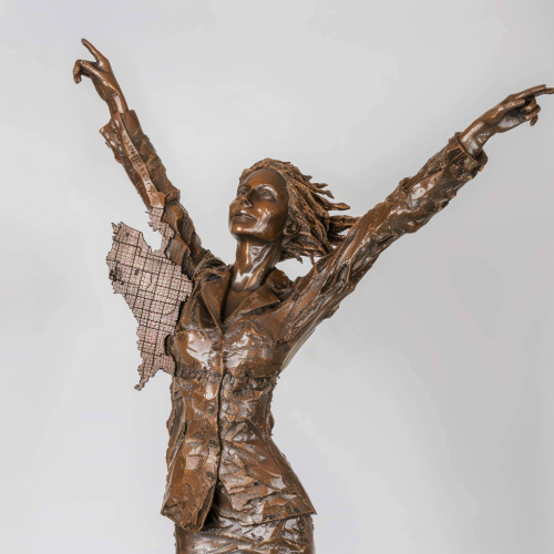A photo of a bronze statue depicting a towering woman, standing in a slightly crouched pose, straining under the immense weight of a model of the map of the United States on her shoulders. Her head is slightly bowed, and Her arms are stretched upwards, supporting the model. --ar 16:9 --v 6.0